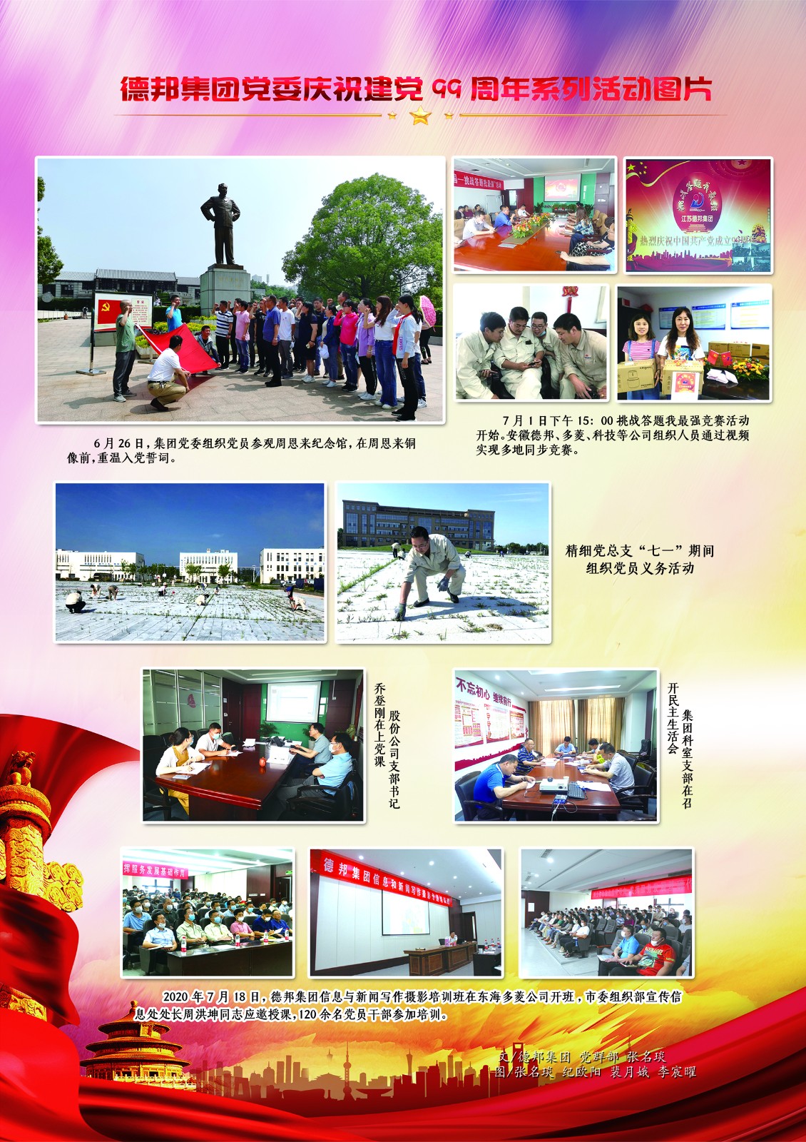 2020年是建黨99周年,為熱烈慶祝黨的生日,貫徹落實2020年兩新組織黨建工作要點,進一步增強各基層黨組織活力、激發黨員的使命感、責任感,德邦集團黨委在“七一”前后開展挑戰答題我最強、專題民主生活會、優秀黨員等先進評選、參觀周恩來紀念館、黨員讀書活動、黨支部書記上黨課、黨員為安全獻言等系列活動慶祝中國共產黨建黨99周年。