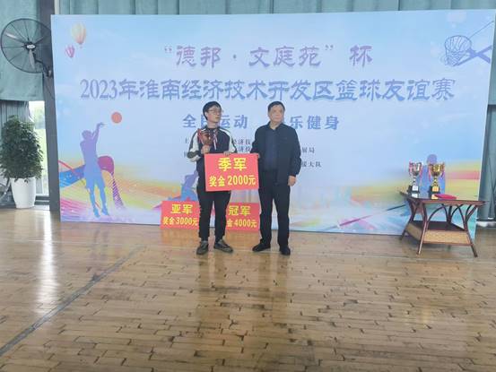 在比賽過程中,各參賽隊伍秉承“友誼第一、比賽第二”的原則,充分展現了“更高、更快、更強”的體育精神。他們在賽場中頑強拼搏,奮力爭先,以高昂的斗志,高超的球藝,賽出了風格,賽出了水平,賽出了友誼。經過五天的激烈角逐,安徽德邦籃球隊在小組賽中以第一名的成績出線,并在422日的總決賽中獲得亞軍。淮南市經開區黨工委委員、紀檢工委書記朱英魁、安徽德邦化工有限公司黨總支書記劉默海為獲獎隊伍頒發獎杯和獎金。